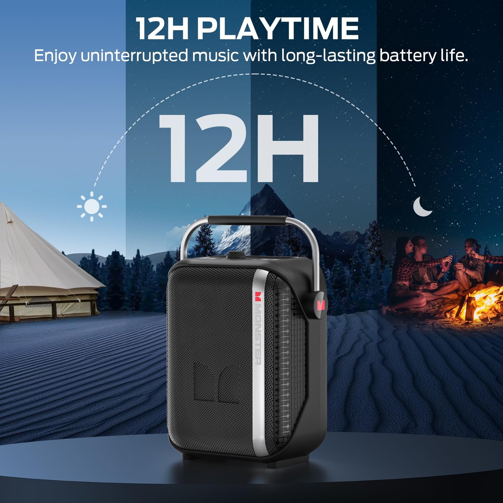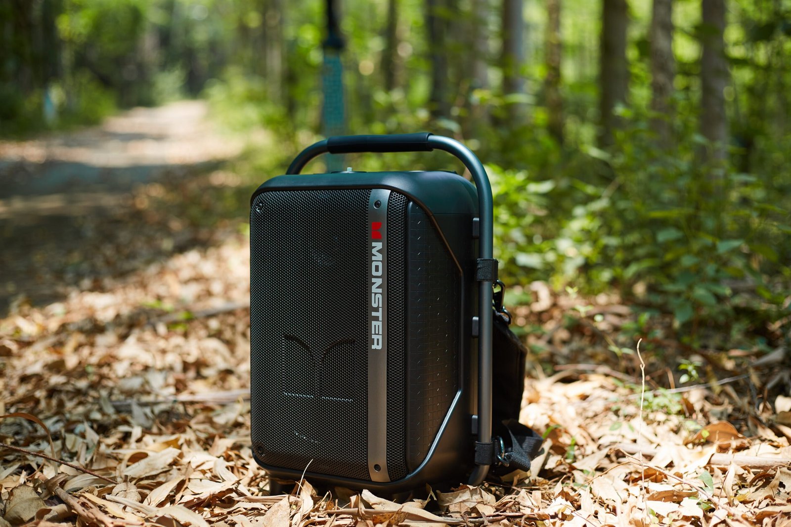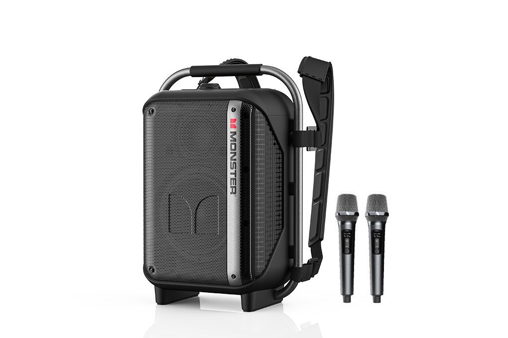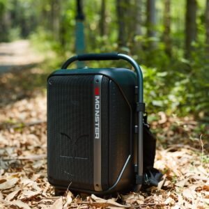 The Monster Traveler High Power Backpack Speaker features a rugged and portable design, making it ideal for travel and outdoor use. It includes a built-in backpack strap for easy carrying and durable construction for reliable performance.