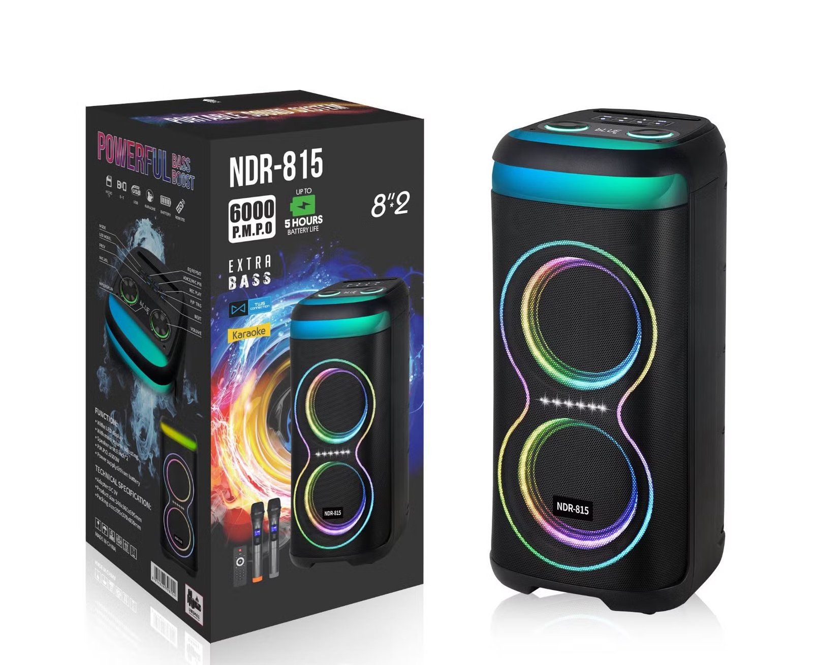 The NDR 815 is a portable karaoke speaker designed for vibrant sound and wireless convenience. With an 8″ woofer and multicolor LED lighting, it’s perfect for home entertainment, small events, and outdoor gatherings.